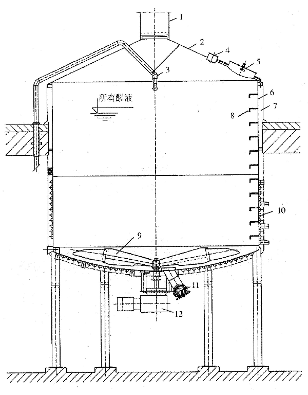 1-醪液進(jìn)口 2-麥糟暫存箱 3-耕糟機(jī) 4-清洗環(huán)管 5-照明 6-人孔 7-排氣管 8-調(diào)節(jié)閥 9-視鏡 10-假底清洗管 11-過(guò)濾泵 12-耕糟機(jī)的升降和驅(qū)動(dòng)裝置